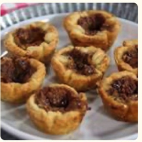 Once chilled, toss a few chopped pecans or raising, if using, in each tart shell and top with about two tablespoons of that lovely filling. Bake the tarts for eight minutes then reduce the heat of your oven to 400°F. Open your oven door for about five to ten seconds to quickly bring the heat down then close the oven and continue to bake for 10 to 12 minutes or until the filling is puffy and the pastry is golden.