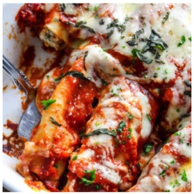 Snip off the corner of the zipper bag if using and fill each cannelloni placing in the pan. Top with remaining marinara sauce.
