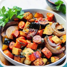 Remove vegetables from the oven after 30 minutes. Transfer them to a clean baking sheet so they don’t get soggy in the accumulated juices and oil in the pan they roasted on. Let them sit at room temperature no more than 3 hours. Cover and refrigerate in if not using for a longer period. They will last up to 4 days in the fridge. When ready, bring veggies to room temperature if they’re not already, bake in 375 degrees F oven for 15 minutes until hot.