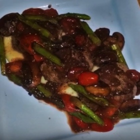 As it cooks down, add bay leaf and 1/4 teaspoon dried thyme. Cook for 3 minutes, stirring occasionally. Add tomatoes, stir and cook for 2 min longer. Place steaks on mashed potatoes and then spread sauce on top.