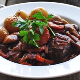 To the pot add the wine and stock. The liquid should barely cover the meat and vegetables. Add the tomato paste, garlic and thyme. Bring to a light simmer on the stove, then cover and simmer in the lower part of the oven for 3 to 4 hours, or until the meat is easily pierced.