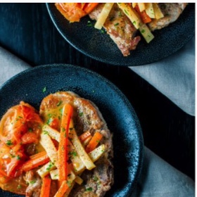 Warm 1 tbsp of olive oil in a skillet on medium high heat. Season pork chops with salt & pepper then add to hot skillet. Fry chops for a few minutes on each side until golden and then put on a plate and set aside.