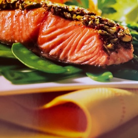 In small bowl, combine mustard and maple syrup; spread over salmon.