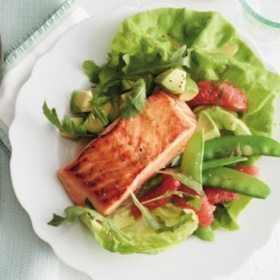 Sprinkle salmon with 1/8 tsp salt. Heat a medium non-stick frying pan over medium-high. Add 2 tsp olive oil, then salmon, skin-side up. Cook until underside of fillet is light golden, about 3 to 4 min.