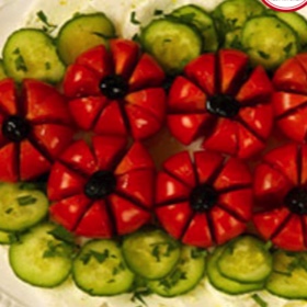 Core tomatoes. Cut each into 8 wedges from stem end almost to base, leaving base intact so wedges form flower shape. Arrange on serving platter.