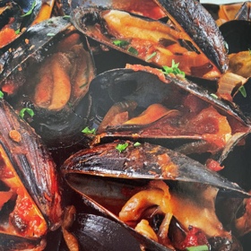 Stir in wine and tomato sauce; bring to simmer. Add mussels; cover with tight-fitting lid. Cook until mussels open, about 5 minutes. Discard any mussels that remain closed. Remove from heat; stir in parsley and tarragon.