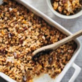 Pour the oat mixture over the apples to cover them evenly. Bake for 30-40 minutes until the topping is browning slightly. Let stand for 15-20 minutes.